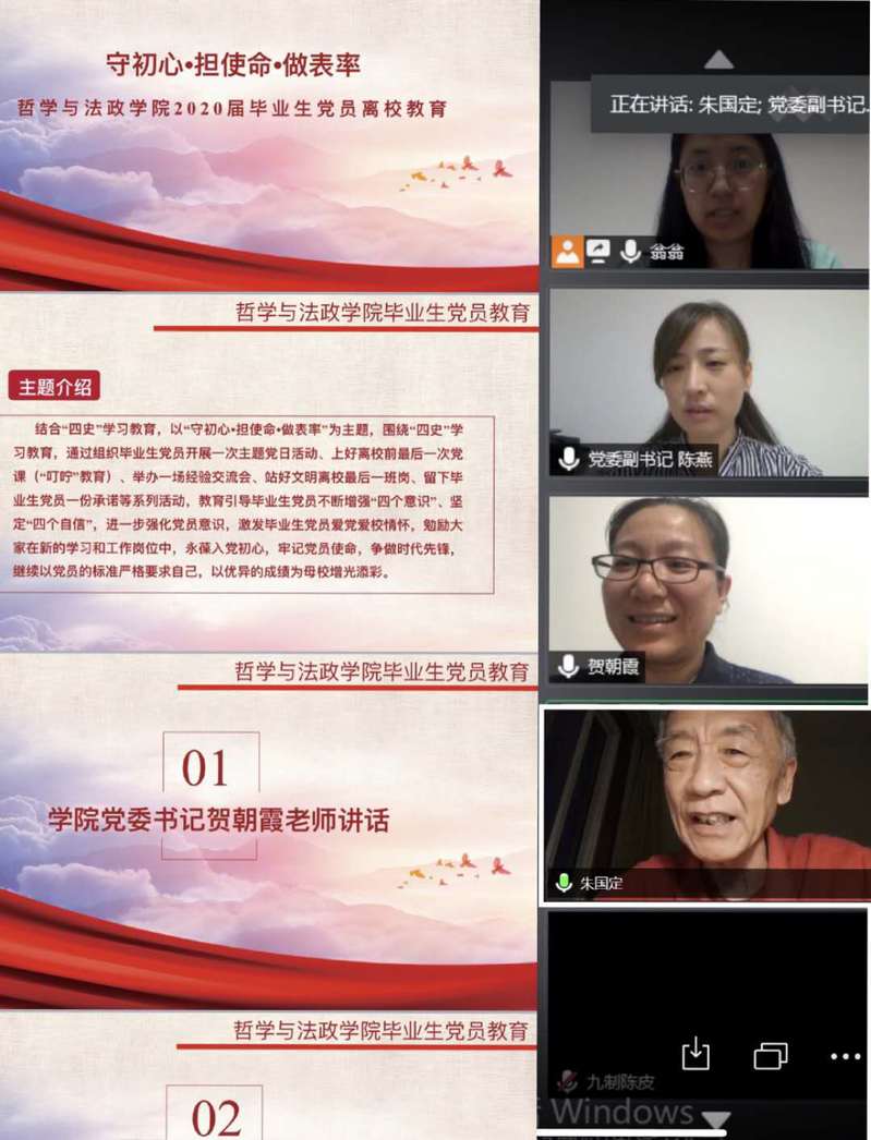 依托腾讯会议线上平台,开展了以“守初心,担使命,做表率”为主题的毕业生党员离校教育会议,学院党委书记贺朝霞、党委副书记陈燕、党委组织员翁娜、毕业班辅导员及全体毕业生党员参与会议,会议由学院党委副书记陈燕老师主持。本次会议还特别邀请关工委老同志、校特邀党建组织员朱国定老师为毕业生党员进行专题讲座。