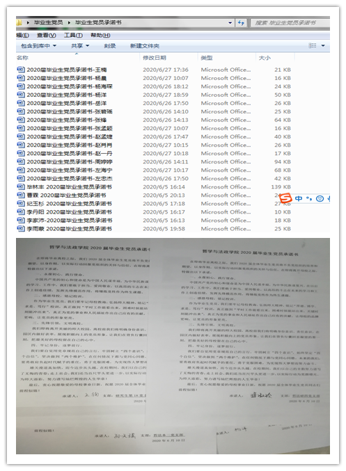 离校前后,引导毕业生党员切实亮出党员身份,树立党员形象,展现党员风采,做文明离校的表率,配合学校维护学生宿舍的正常秩序,以模范行动带动全体毕业生文明、安全、顺利离校。在即将毕业离校之际,哲法学院全体毕业生党员留下一份承诺:永葆初心,践行使命;感恩母校,铭记校训;先锋引领,文明离校;牢记身份,逐梦前行。离校后,自觉把个人命运同祖国和民族的命运紧紧联系在一起;引导毕业生党员提升责任意识,在新的工作岗位上建功立业。