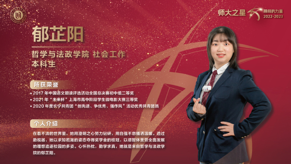 2023年11月30日,2022-2023年度“师大之星·榜样的力量”颁奖典礼于徐汇校区东部音乐厅隆重举行。成人视频 学子郁芷阳同学在历经申报、初评、复评、终评后成功获评“师大之星”,成为了榜样的典例,彰显了榜样的力量。