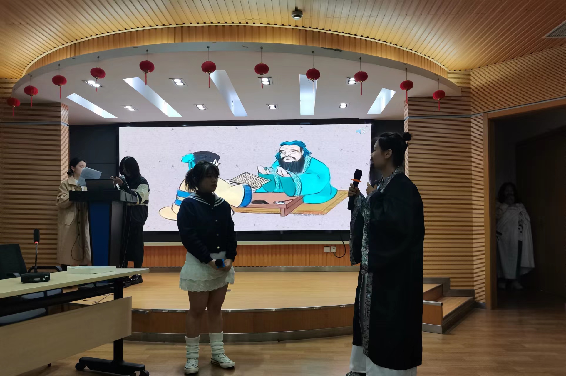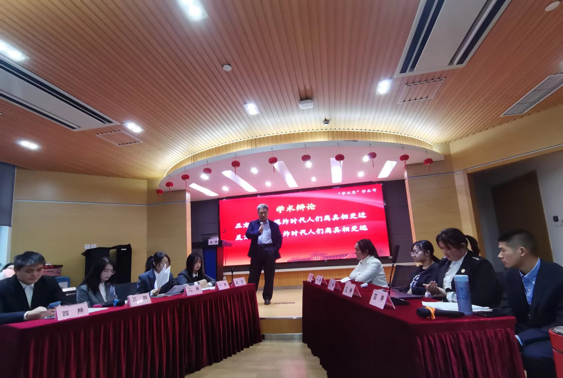 “学而思”学术节历时一天,上午为研究生专场,下午为本科生专场,通过学生学术演讲、教师交叉点评、哲学学术辩论以及哲学话剧等多种形式展现学术节宗旨和目标,展现出丰富深厚的学院哲思之风和学术氛围。在下午的本科生专场中,同学们的论文质量受到各位老师一致认可,风格鲜明,颇具特色。随后关于思辨能力培养与现实问题关注相结合的“学术辩论——信息化爆炸时代人们离真相更近还是更远”由大一哲学班和“道德与法治”师范班同学组成正反辩方,辩论现场精彩纷呈;哲学话剧——《爱的哲思》由大二哲学班同学自编、自导、自演,同学们以“什么是爱”为主题,将孔子、苏格拉底、释迦牟尼、耶稣等圣哲请进话剧之中,以“穿越”的方式呈现了当代哲学学子对哲学问题和真理的追寻和探索,其精彩的表演赢得了形成热烈的掌声。