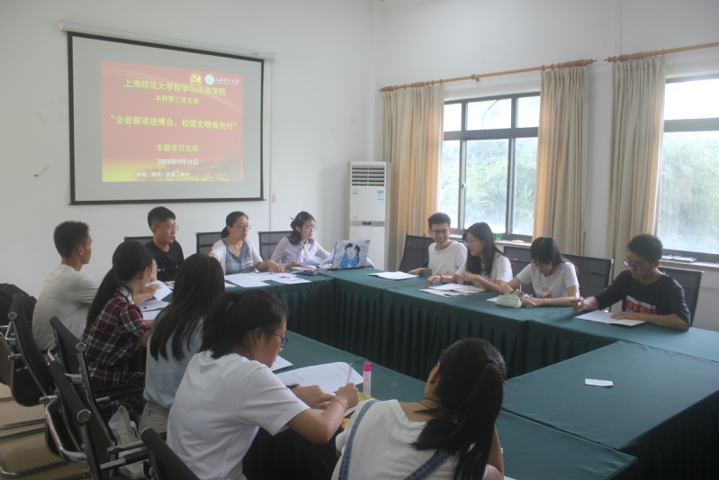 为了响应校党委“进博先锋,党员行动”的号召,成人视频 的本三党支部2018年9月19日12:30在行政楼116会议室举行了主题为“全面解读进博会,校园文明我先行”的主题党日活动,旨在通过丰富的形式了解进博会,并且将“进博先锋”的精神落实到校园日常生活之中。