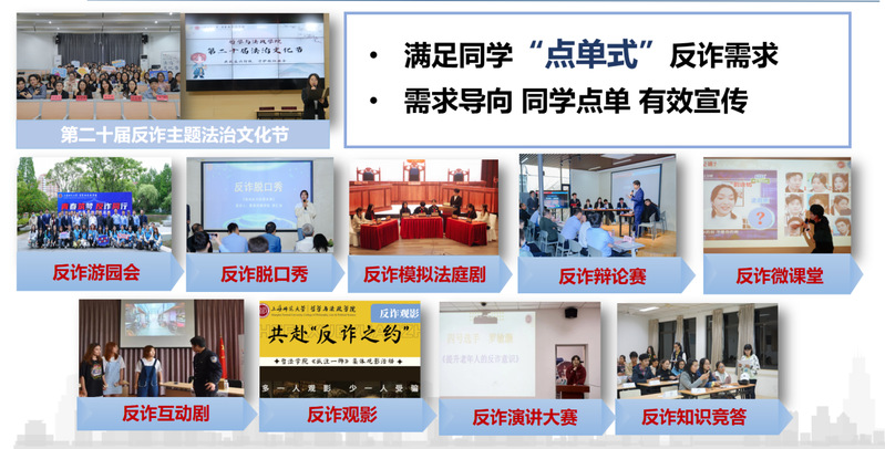 自2021年9月开展以来,项目以校院两级学生会组织为纽带,依托成人视频 法学专业优势,积极与上海市公安局文保分局、保卫处开展警校联动,共同打造线上线下结合的学生反诈宣传平台,有效提升了同学们的反诈意识和识骗防骗能力,将学生会组织“为同学服务”的宗旨落实、落细。