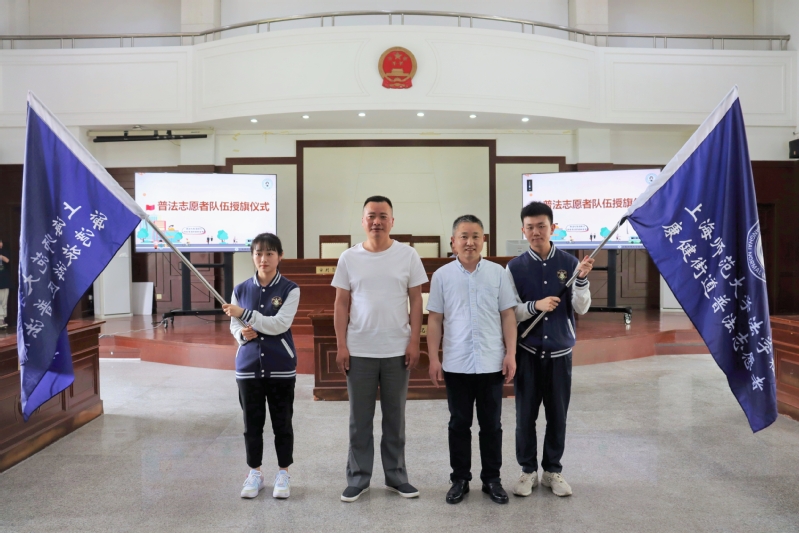 徐汇区康健街道紫鹃居委会党总支书记何朱记和奉贤区海棠社区居委会党支部书记、居委会主任许立群为普法志愿者队伍授旗,夯实志愿者队伍力量,打造“高校-社区”联动的优质社团。