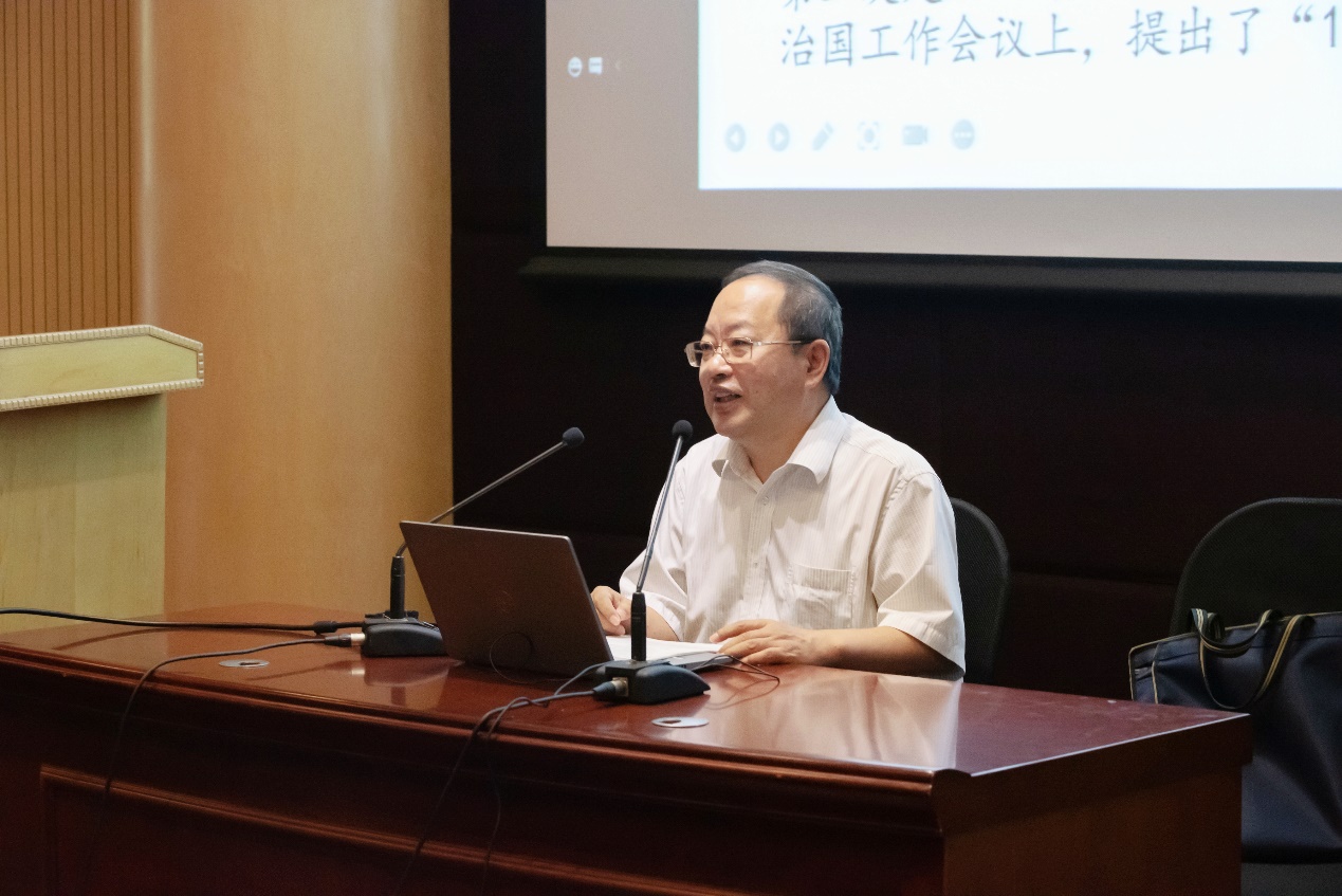 法治第一课,筑牢新生法治思想。上午,蒋传光教授从习近平法治思想核心内容、发展历程、历史地位、重大创新等方面进行了讲授。他强调习近平法治思想是“马克思主义法治理论中国化第三次飞跃的理论成果”,深刻全面地回答了一系列带有方向性,根本性,全局性的重大问题,进一步创新和发展了中国特色社会主义法治理论。习近平法治思想是体现人民利益、反映人民愿望、维护人民权益、充分体现人民意志的思想,是对中国共产党领导法治建设丰富实践和宝贵经验的科学总结,是党和人民实践经验和集体智慧的结晶。课后,蒋传光教授还与同学们进行了互动交流,同学们纷纷表示,今后将担负起时代使命,更好地为中国法治建设添砖加瓦。