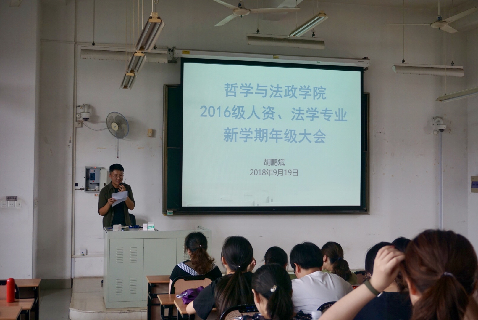 2018年9月19日下午13:30,2016级人资专业、法学专业新学期年级大会在三教402教室准时召开。辅导员胡鹏斌老师为全体同学介绍了大三学期的基本情况,提醒大家为接下来的校园生活做好准备。