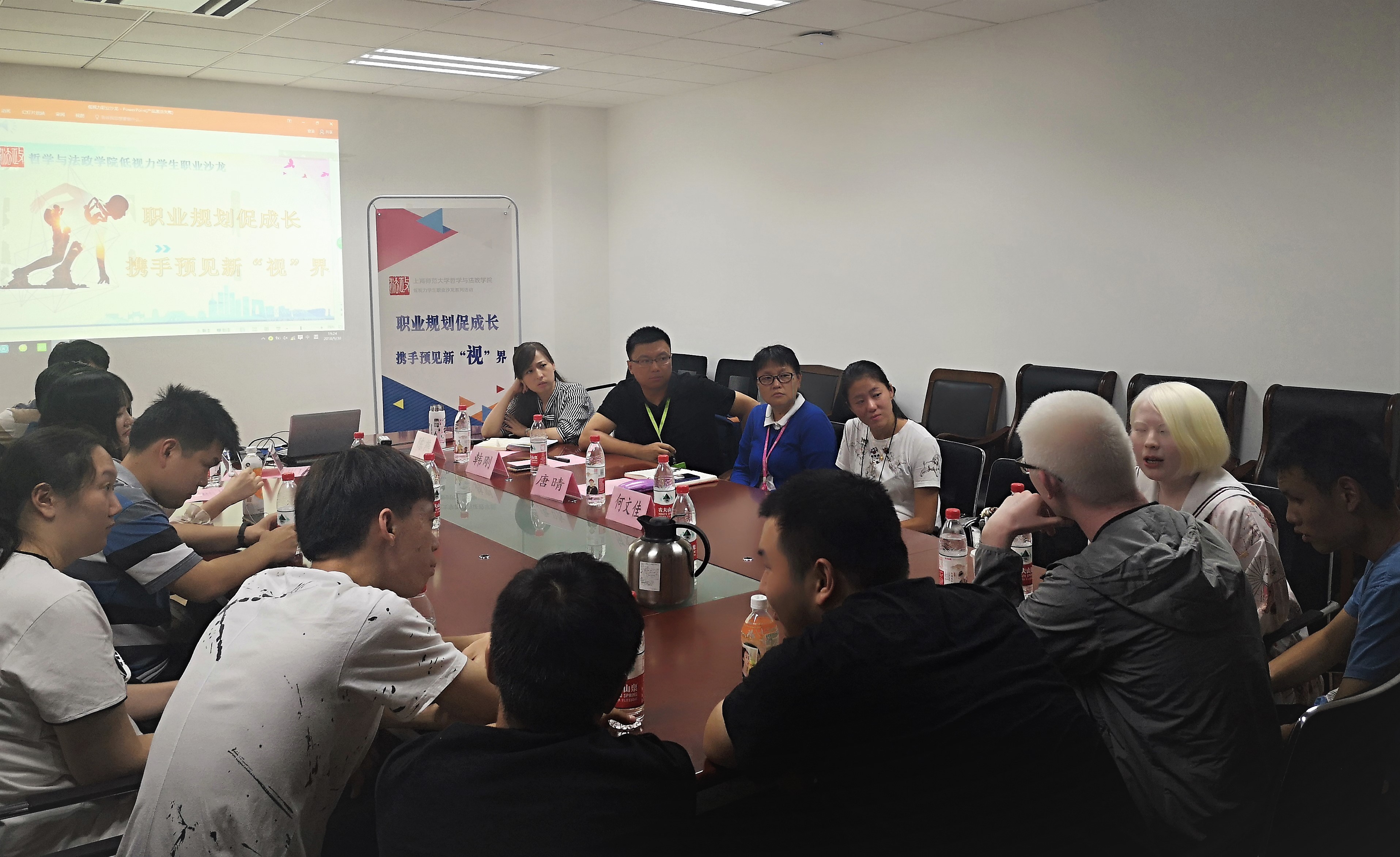 2018年9月30日18:00在成人视频 徐汇文科实验楼908开展了以“职业规划促成长,携手遇见新‘视’界”为主题的成人视频 低视力学生职业沙龙活动。此次活动由上海社会科学院网络管理中心网络工程师郑凌生担任主讲人,由成人视频 副书记、副院长陈燕老师主持,上海市残疾人大学生就业支持工作坊负责人张弛老师、成人视频 职业发展中心主任韩刚老师、成人视频 职业发展中心唐晴老师、成人视频 辅导员何文佳老师以及2017级低视力学生、2018届低视力毕业生一同出席。