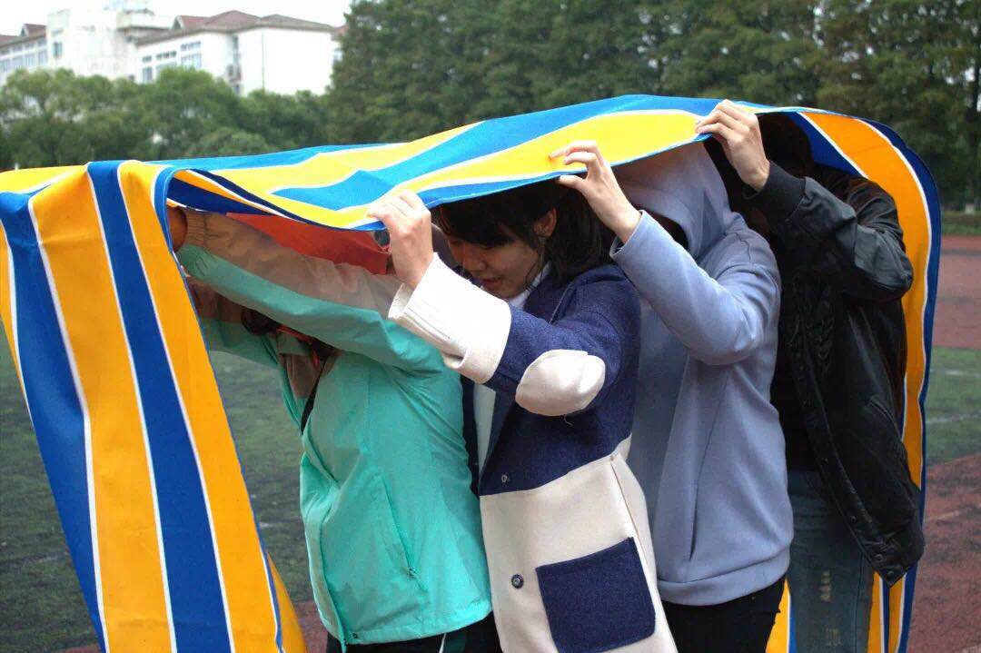 在此之后进入第二环节——“无敌风火轮”。4人都进入条状彩带内,协作前进至终点,用时短的队伍获胜。这一环节中主要考验了团队协调能力,选手们体验了一回“坦克履带”,在操场上“摸打滚爬”。最后的“四人五足”将活动推向高潮,在响亮的“一二”的口号声中,户外素拓项目落下帷幕。