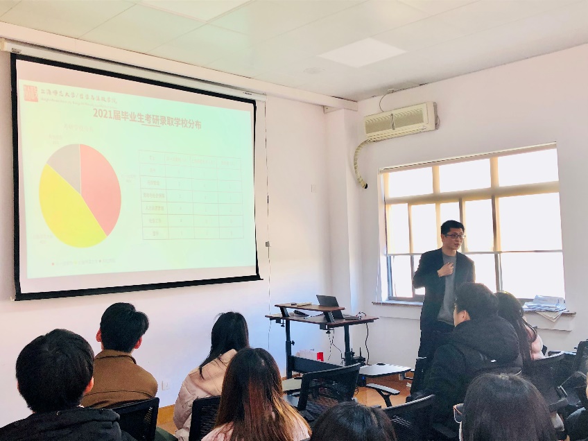 为帮助同学们充分了解当前考研形势,明确考研目标,端正考研心态,提升考研指导工作的针对性和有效性,2021年12月22日下午,成人视频 于奉贤校区行政楼406举行2019级学生骨干考研规划指导讲座。本次讲座由成人视频 党委副书记、副院长姚秋磊老师主讲,成人视频 2019级学生骨干40余人参加。