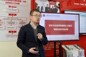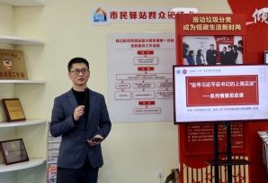 学悟思想“大哲理”,让思政课有知更有智。姚秋磊首先为同学们带来课程引入,勉励在场同学作为师范生在参观嘉兴路街道市民驿站时要有观察学习的意识,总结所学所思、所观所感,将知识内化为教学设计,推动思政教育大中小一体化蓬勃发展。张振洋以“党建引领基层治理”为主题,为学院思想政治教育(道德与法治)专业的同学们上了一堂生动的沉浸式情景思政课。他围绕“人民主体性”的理论核心,从“一切为了人民”的价值导向与“一切依靠人民”的实践路径两个维度展开系统阐释,通过学理剖析引导在场学生深化对新时代基层治理方法论的认识。并明确提出育人工作的三个定位:要淬炼政治素养,做社会主义核心价值观的坚定引领者;要扎根基层实践,做社会治理现代化的积极践行者;要创新教学方法,做党的创新理论的有效传播者。