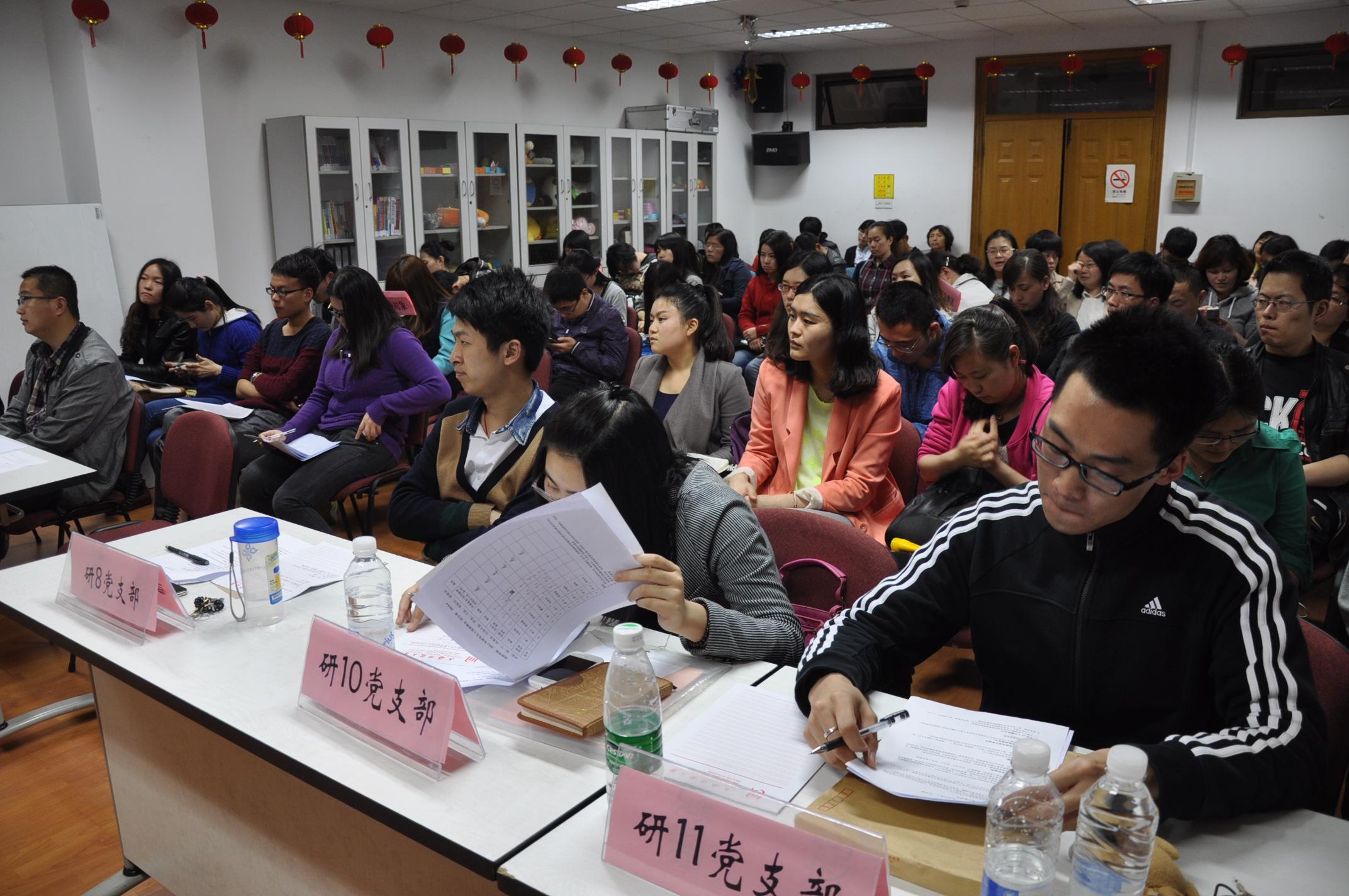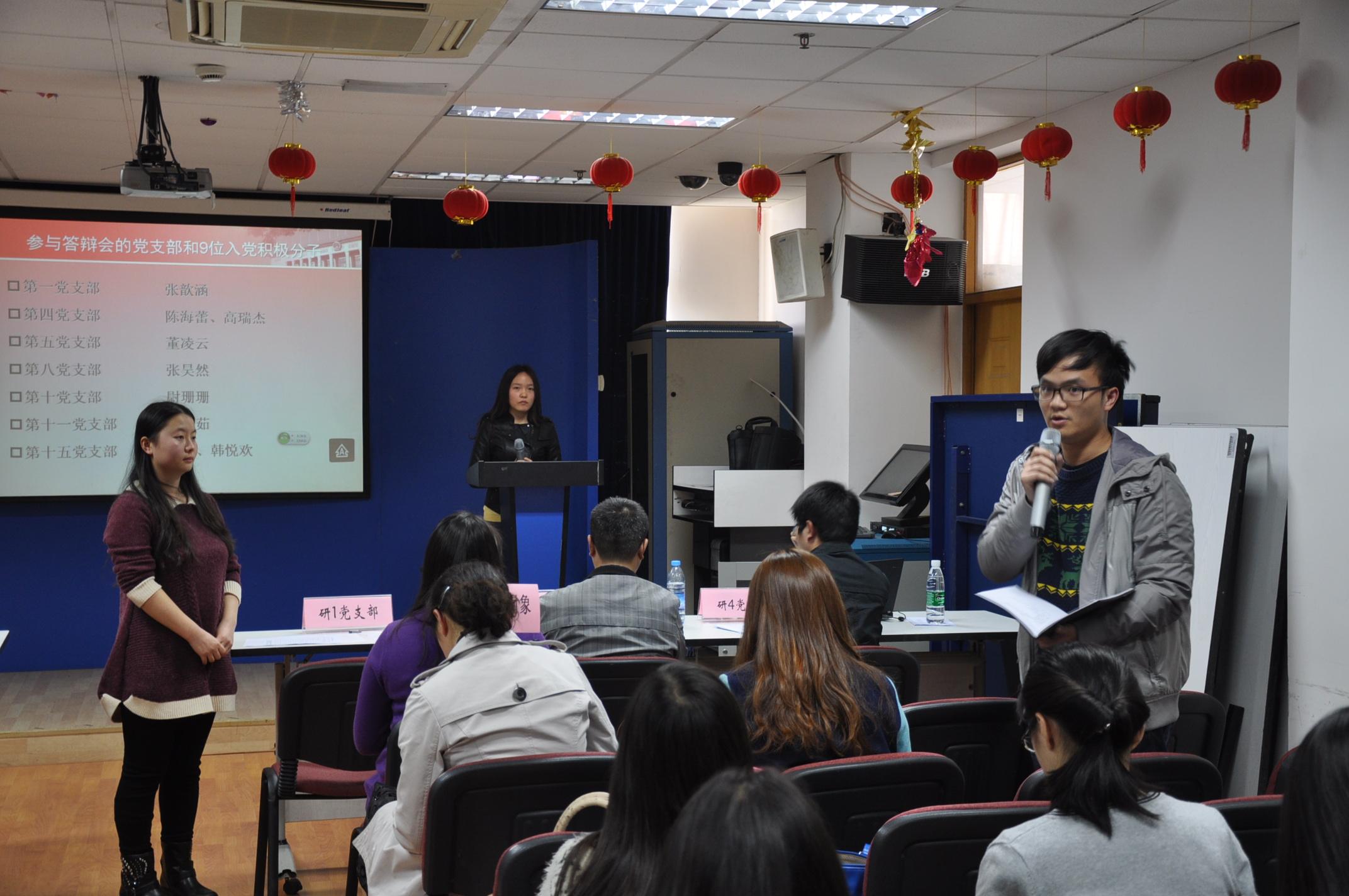 出席会议的有:本批次推荐发展对象的研究生第1、4、5、8、10、11、15等七个党支部的党员、参加答辩的研究生入党积极分子9人。评委由上述7个研究生党支部书记担任、第一党支部书记殷一宁兼任主持。