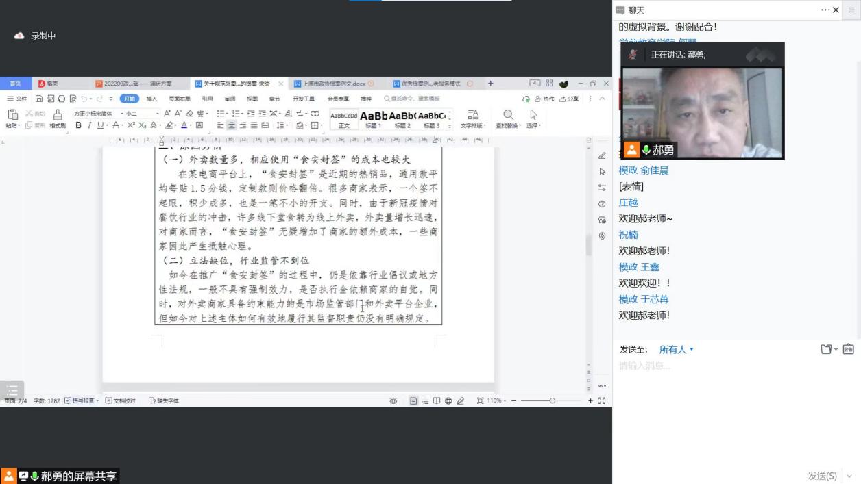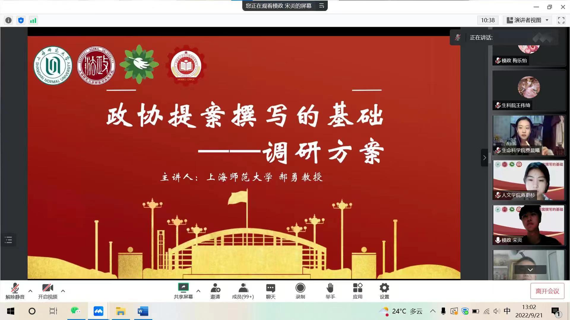 此次大赛特邀上海市第十三届政协委员,长宁区第十三、十四届政协委员郝勇教授作了关于《政协提案撰写的基础——调研方案》的专题讲座。郝勇教授围绕调查研究方法、问题选择、调查研究基本方式、问卷调查方法四个部分,为参赛团队讲授了一场全面而系统的提案撰写培训课程,并以本次某参赛提案为例进行细致点评。