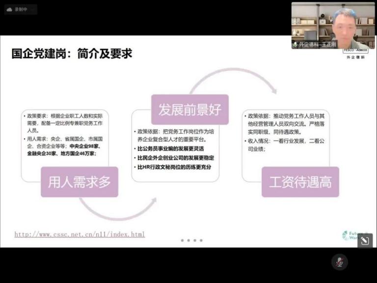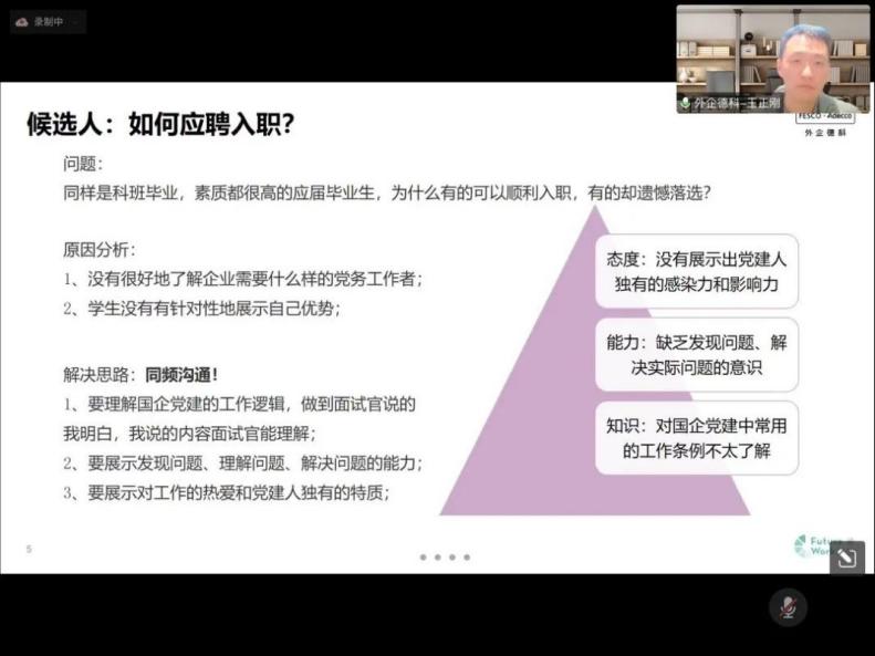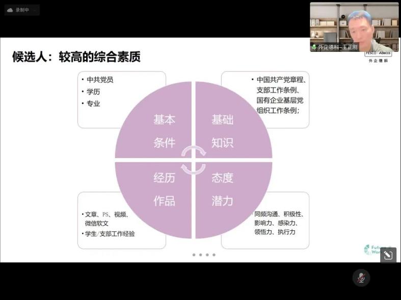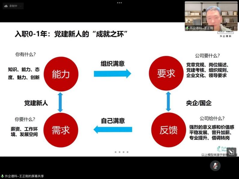王主任从宏观上介绍了国企党建的整体现状与招聘要求,进而有针对地讲解如何应聘入职,并系统地描述了党建新人的“成就之环”与“成长之轮”。