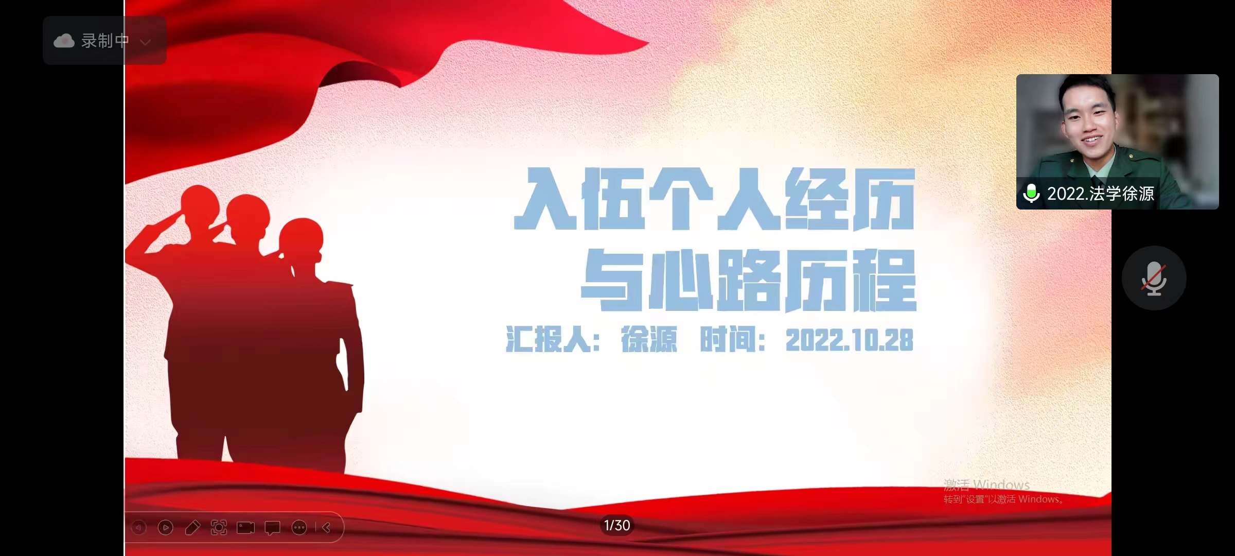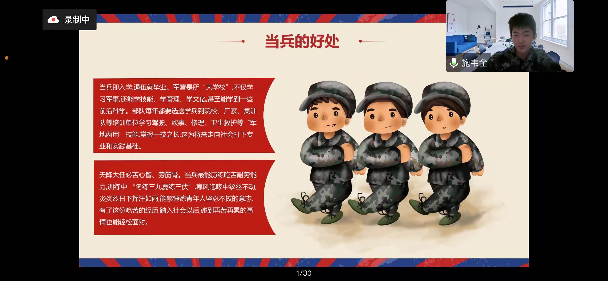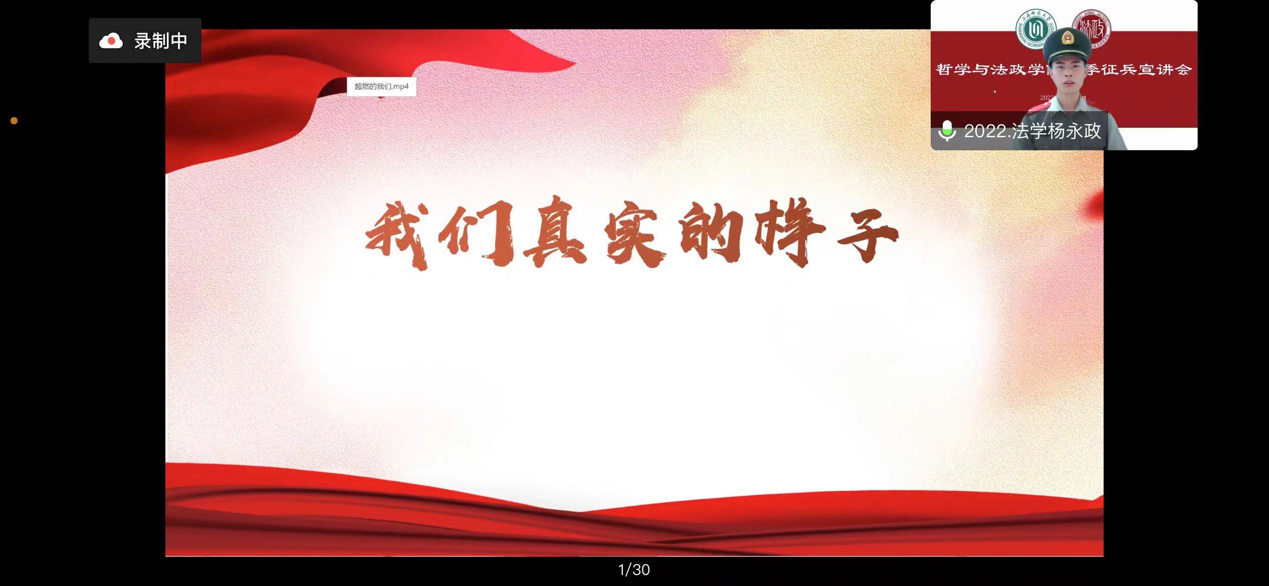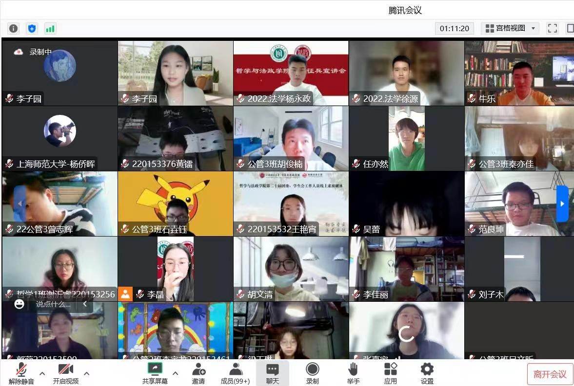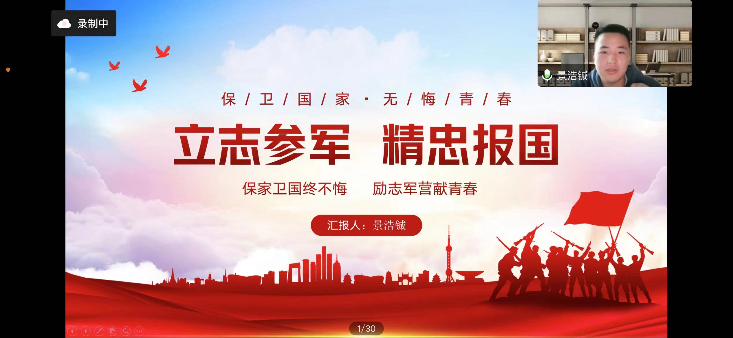 为加强征兵政策宣传,做好大学生应征入伍工作。2022年10月28日14:00,成人视频 春季征兵宣讲会在线上顺利举行,学院兼职辅导员牛乐和景浩铖、杨永政、施韦全、徐源四位退伍复学同学作征兵入伍政策宣讲和军旅生涯分享, 2022级全体本科生、部分本科毕业生和研究生参加。