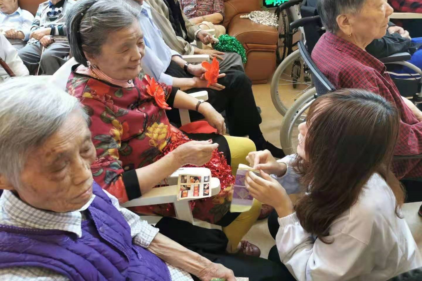 10月7日早上8:20,志愿者们已全部到达活动场地兰公馆养老院。活动开始前,志愿者们先进行了自我介绍,并送上了对老人最真挚的祝福。活动正式开始,志愿者们展示了朗诵节目,以身着迷彩服,校服,社服的三个方阵展现了不同时代的精神风貌和国家变迁。老人看后深有感触,为国家的变化而欢欣鼓舞。为了活跃现场氛围,志愿者们紧锣密鼓地开展了针对老年人的听歌识曲,播放了他们那个年代所熟知的红歌金曲,勾起了他们遥远的回忆和强烈的爱国热情。听完老歌,猜完金曲,志愿者们与老人一起做香包。一针一线,编织的是心意;一言一语,交谈的是心声。在与老人一起做手工的过程中,志愿者们更加了解他们的生活,拉近了距离。赠人香包,手有余香,志愿者们送出去的不仅仅是香包,更是对老人的心意,收获的不仅仅是一张张笑脸,更是其乐融融的温馨与鼓励。活动即将接近尾声,志愿者们和老人一起合唱《我和我的祖国》。手中红旗随风飘扬,心中热情越燃越旺。至此,活动已经结束,社会实践部的志愿者们同这次参加活动的老人一起合影,以纪念这次的温馨美好,富有意义的活动。