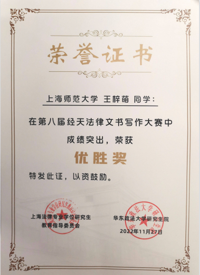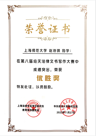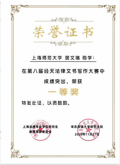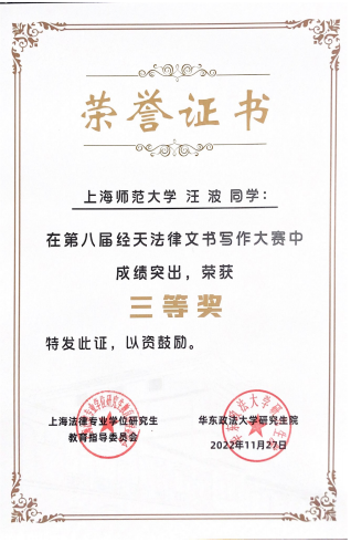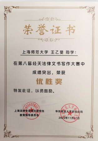 近日,由上海市法律硕士专业学位研究生教育指导委员会主办的第八届“经天”法律文书写作大赛结束。