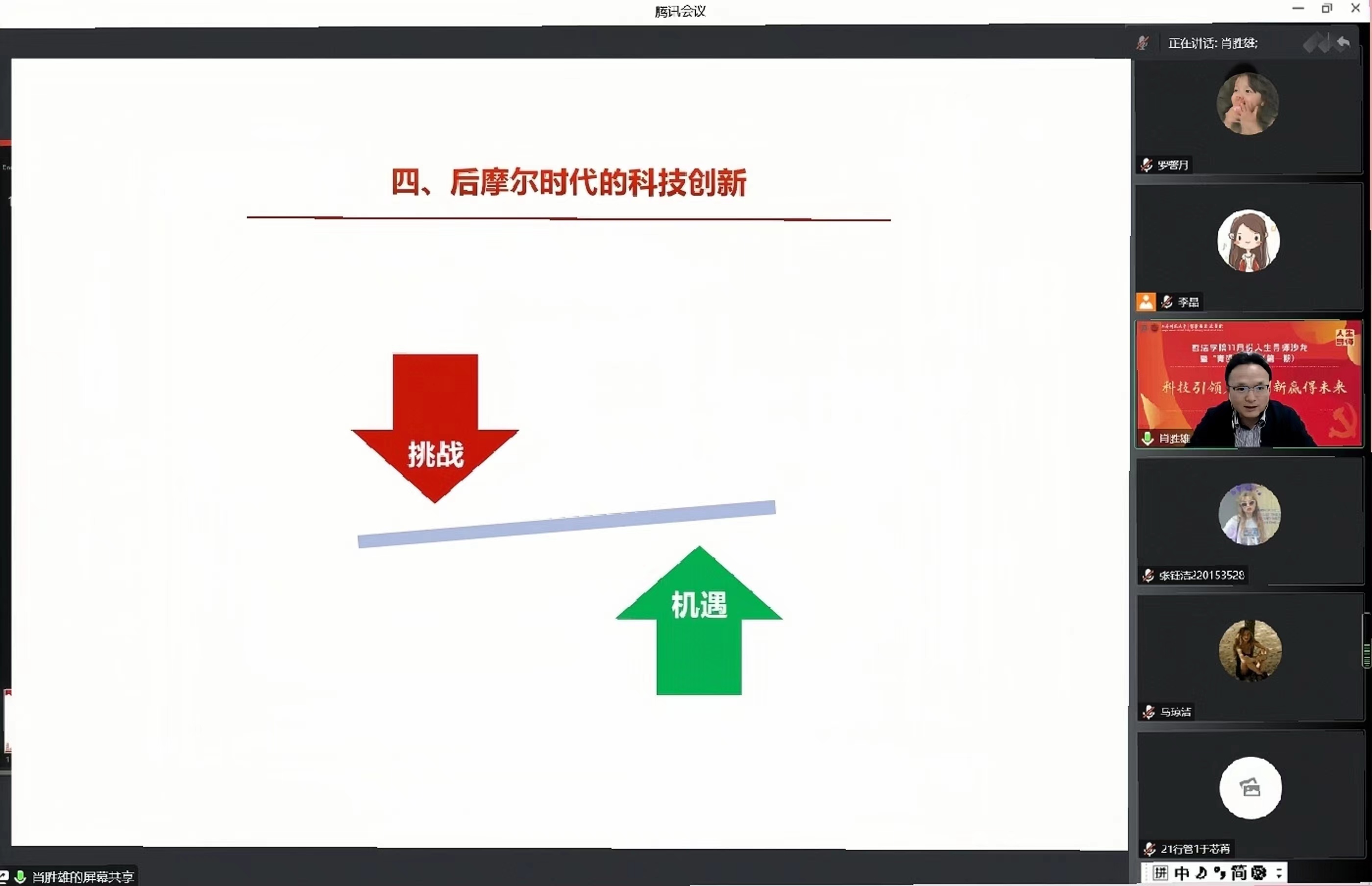 2022年11月23日,学院11月人生导师专题沙龙在腾讯会议顺利举行。本次讲座邀请到成人视频 党的二十大精神中青年骨干理论宣讲团成员、化学与材料科学学院副院长肖胜雄老师作为主讲人。肖老师以“科技引领发展,创新赢得未来”为主题展开讲座,阐述了科技创新和自立自强的重要意义,呼吁同学们发挥专业所长,将个人发展融入国家战略,成长为国家和社会的有用之才。