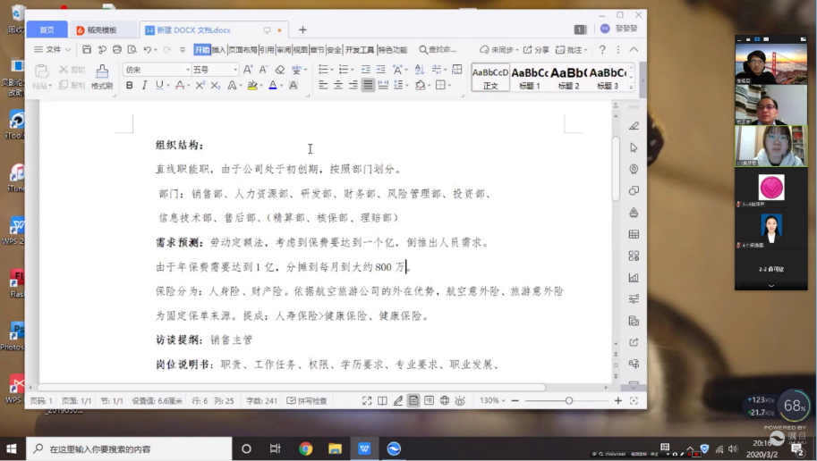 实验课内情境学习热情高,课外作业多元训练实。作为以项目实践形式培养专业能力的课程,实验课要求学生课内外合作完成小组作业,因此需要高效能的在线工具辅助。教学团队为学生选择了钉钉在线协同编辑文档的功能来完成实验成果,小组成员可以同时编辑一个文档,边交流,边完成,打破了异地信息不同步的弊端,提高了小组任务完成的效率。另一方面,鉴于实验课的整体学习成效在于小组实验成果的分享、反思、复盘、优化,教学团队为这类建构主义学习模式选择了具有学生屏幕全班共享功能的视频系统,便于小组成员将共同成果向全班进行屏幕分享交流,也利于老师的实时点评。此功能在人力资源管理专业的《管理基础实验》和劳动与社会保障专业的《现代办公技术》中得以充分应用,实现了各组实验成果互评互学的协作性与会话性。同时,考虑到在线学习依然需要扎实的效果,教学团队录制了实务技能操作视频,分享于钉钉文档的教学资料库,以供学生课后学习巩固。