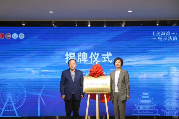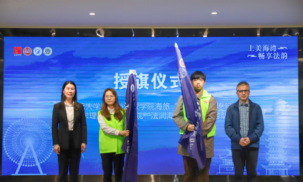奉贤区委政法委副书记、区禁毒办副主任陆冬杰与区信访办副主任宋春艳为学院海旅灋小宣志愿服务队授旗。海湾旅游区党工委副书记、管委会主任姚红与蒋传光院长共同为学院“七棵树灋灋驿站”揭牌。