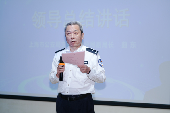 上海市公安局文化保卫分局副局长曲东为本次活动做总结讲话,他指出,校园反诈建设是守卫平安校园的关键一环,本次活动对提高校园“识诈、反诈”教育有着深远影响,作为警方一定会团结凝聚好广大师生群众,共同创建“无诈”校园。