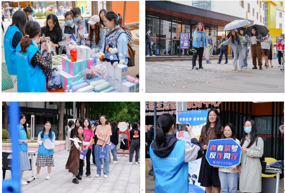 室外专题游园会共设有五个游戏摊位,项目包括:反诈“口口传”、击退“骗局”、全票打“飞”杀猪“盘”、小心中圈套和跟“骗局”Say Bye Bye。现场同学们积极参与游戏,并根据不同的奖章数量兑换相应奖品。各个摊位前人头攒动,欢声笑语不断,吸引了近千名师生热情参与,让大家寓教于乐,在一个个小游戏中不断积累反诈新知识。